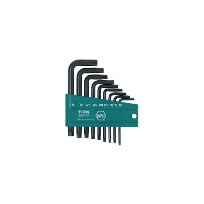 Wiha Torx® L-Key Short Arm L-Key Set, 9 Piece. Includes: T8, T9, T10, T15, T20, T25, T27, T30, T40. Black Finish. High alloy chrome-vanadium-molybdenum steel, hardened.